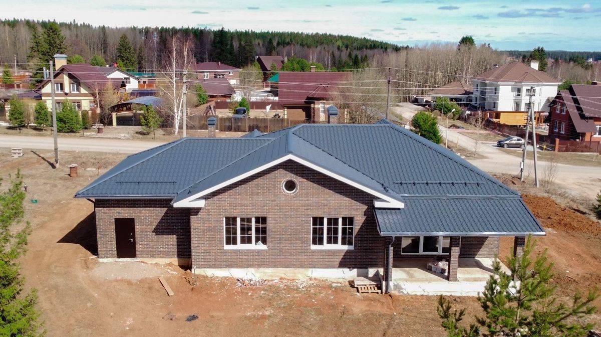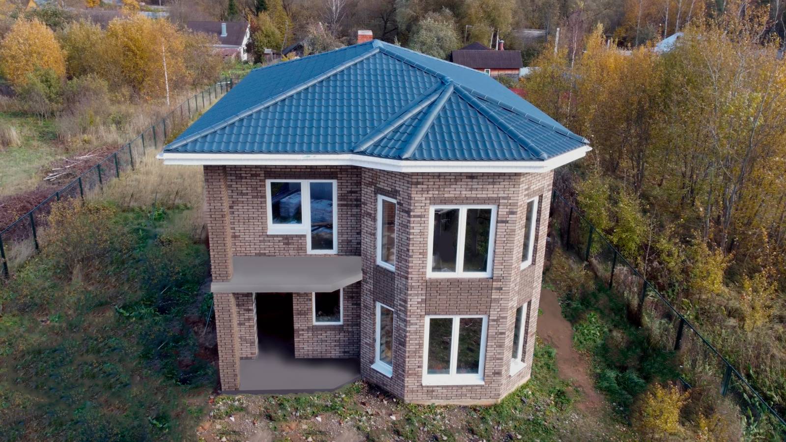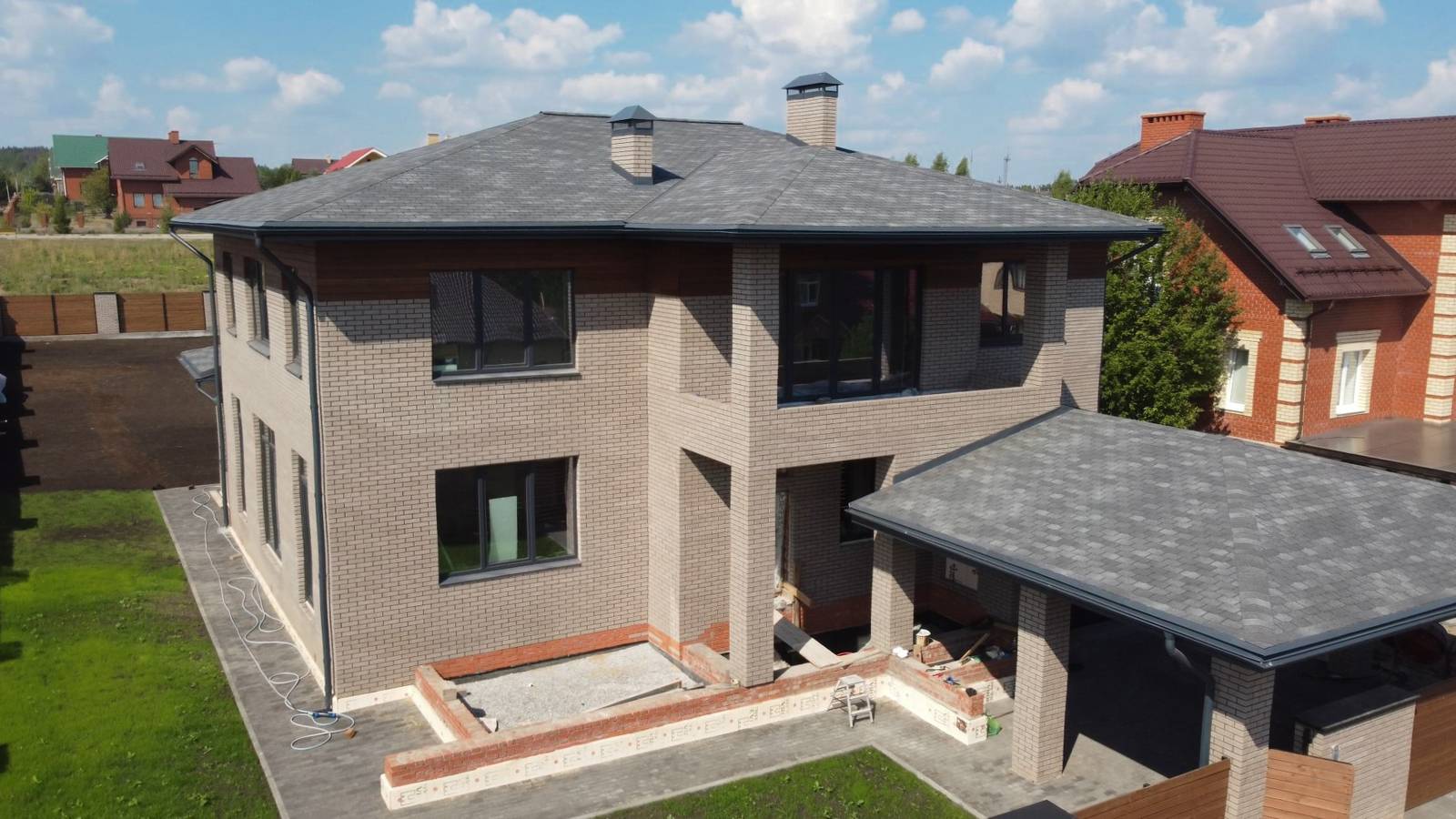 При строительстве этого дома использовался газобетон марки D 500. Облицовочный одинарный кирпич и планкен. Кровельное покрытие – битумная черепица. Железобетонные плиты перекрытия. В доме предусмотрены: балкон, 2 террасы, навес для машины, сауна и спортзал. Срок строительства – 4 месяца