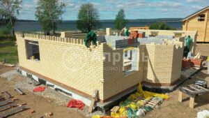 При строительстве этого дома использовался газобетонный блок марки D 500. Облицовочный кирпич полуторный двух видов марки М 200. Кровельное покрытие металлочерепица «Монтеррей». В доме есть терраса. Срок строительства 3 месяца.
