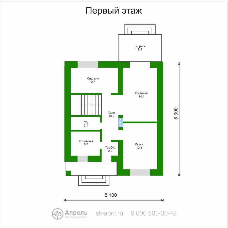 Стеновой блок Teplit D 500 (600x400x250), армирование стен (первый и каждый третий ряд + подоконные и дверные проемы). Армирующий железобетонный пояс (сечением 350х150 мм с утеплением по внешнему периметру). Оконные и дверные перемычки (стальной уголок равнополочный)