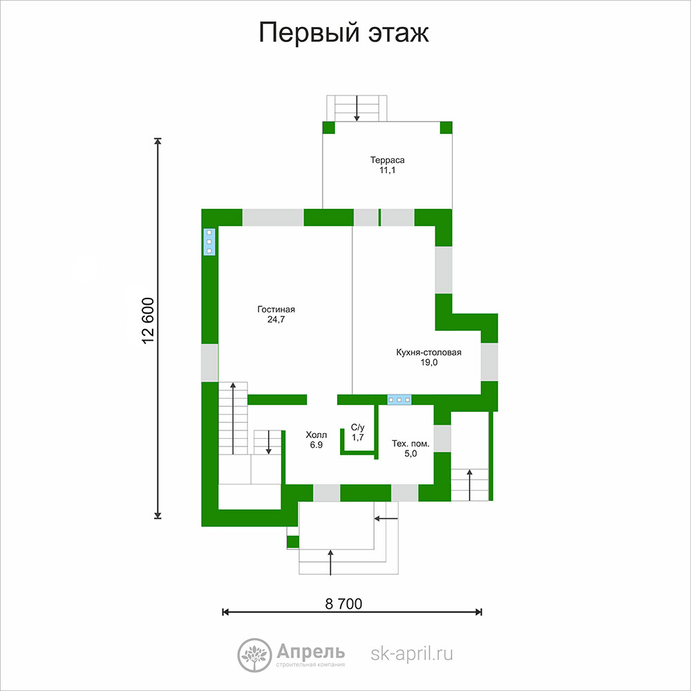 Стеновой блок Teplit D 500 (600x400x250), армирование стен (первый и каждый третий ряд + подоконные и дверные проемы). Армирующий железобетонный пояс (сечением 350х150 мм с утеплением по внешнему периметру). Оконные и дверные перемычки (стальной уголок равнополочный)