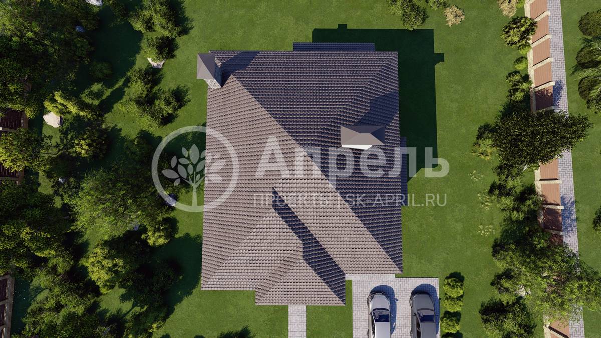 Стропильный каркас (доска сечением 200х50 мм), обрешетка (доска сечением 150х25 мм). Контробрешетка из бруска (50х50 мм). Пропитка пиломатериала огнебиозащитой. Ветро-влагозащитная мембрана Изоспан. Кровля — металлочерепица Grand Line (толщина 0,5 мм). Обшивка свесов кровли виниловыми софитами, монтаж ветровой планки.
