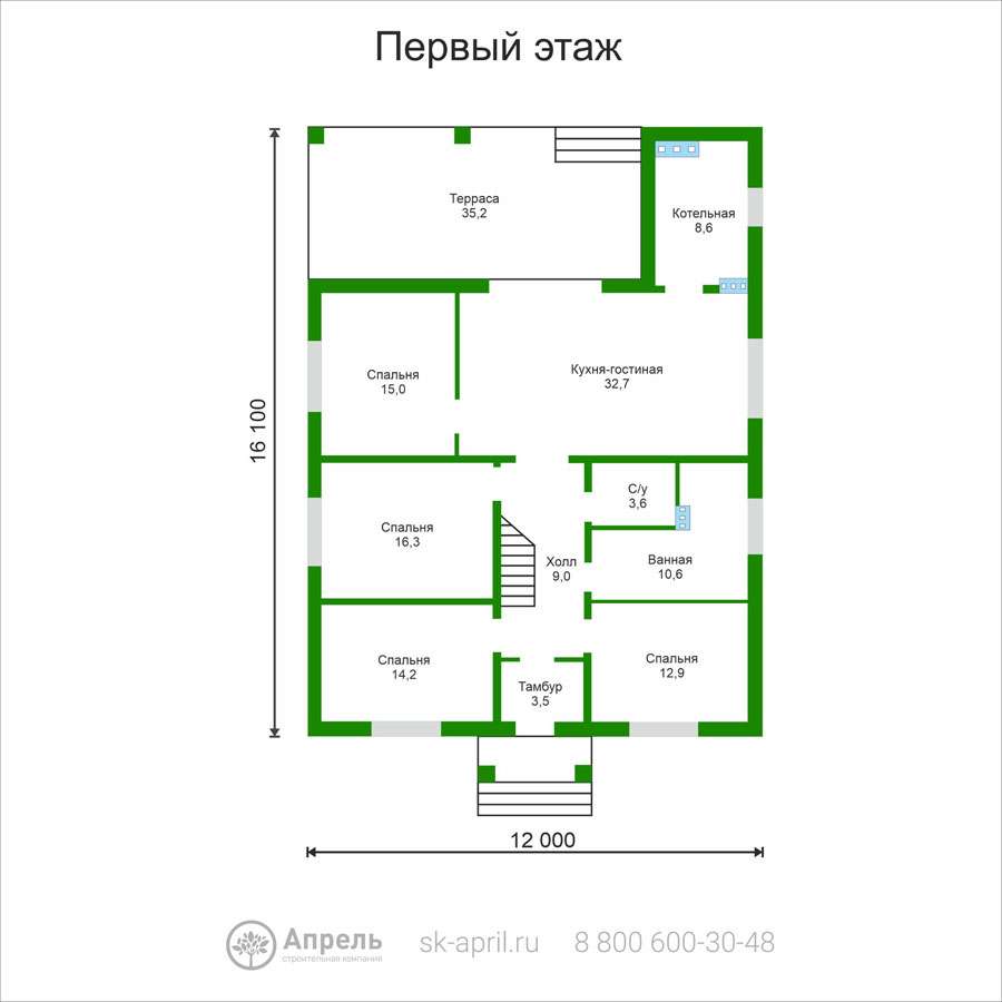 Стеновой блок Teplit D 500 (600x400x250), армирование стен (первый и каждый третий ряд + подоконные и дверные проемы). Армирующий железобетонный пояс (сечением 350х150 мм с утеплением по внешнему периметру). Оконные и дверные перемычки (стальной уголок равнополочный)