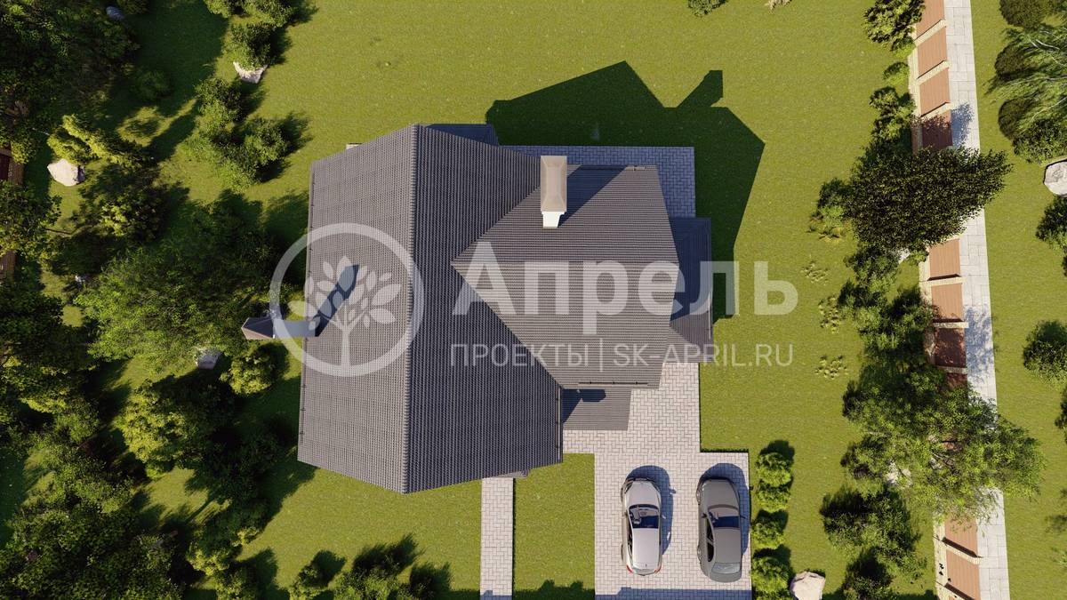 Стропильный каркас (доска сечением 200х50 мм), обрешетка (доска сечением 150х25 мм). Контробрешетка из бруска (50х50 мм). Пропитка пиломатериала огнебиозащитой. Ветро-влагозащитная мембрана Изоспан. Кровля — металлочерепица Grand Line (толщина 0,5 мм). Обшивка свесов кровли виниловыми софитами, монтаж ветровой планки.