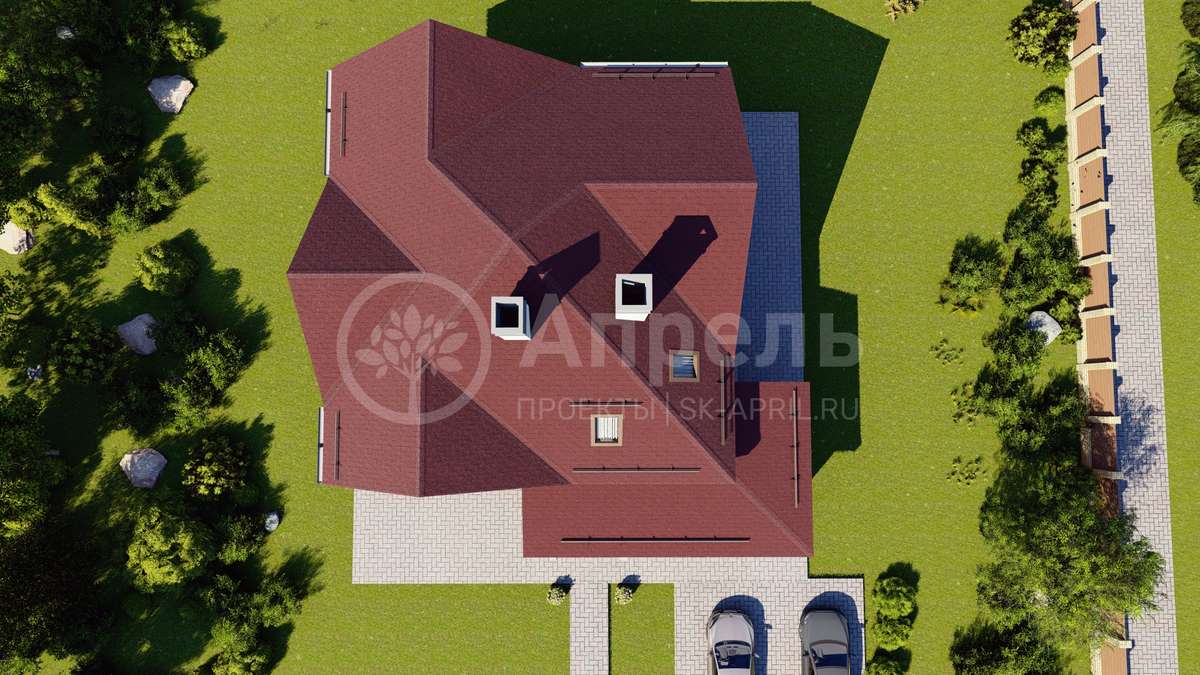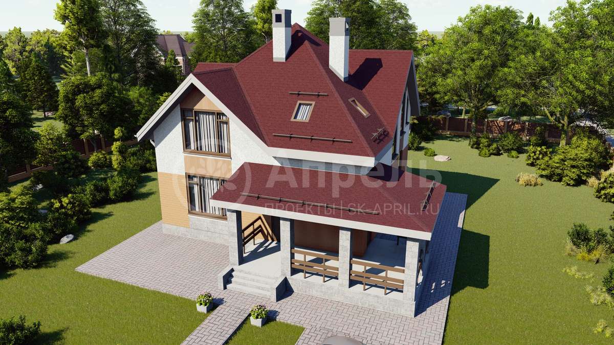 Стропильный каркас (доска сечением 200х50 мм), обрешетка (доска сечением 150х25 мм). Контробрешетка из бруска (50х50 мм). Пропитка пиломатериала огнебиозащитой. Ветро-влагозащитная мембрана Изоспан. Кровля — металлочерепица Grand Line (толщина 0,5 мм). Обшивка свесов кровли виниловыми софитами, монтаж ветровой планки.