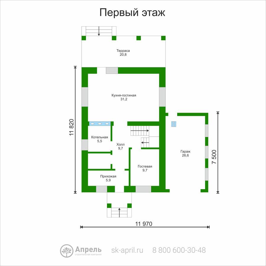 Стеновой блок Teplit D 500 (600x400x250), армирование стен (первый и каждый третий ряд + подоконные и дверные проемы). Армирующий железобетонный пояс (сечением 350х150 мм с утеплением по внешнему периметру). Оконные и дверные перемычки (стальной уголок равнополочный)