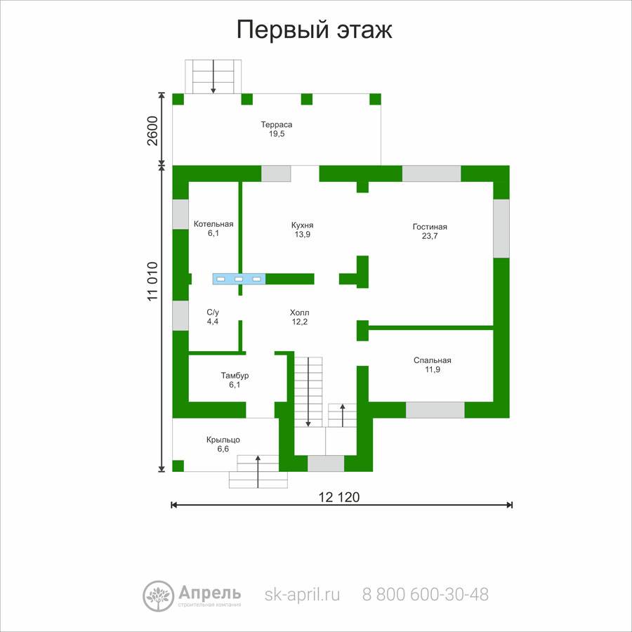 Стеновой блок Teplit D 500 (600x400x250), армирование стен (первый и каждый третий ряд + подоконные и дверные проемы). Армирующий железобетонный пояс (сечением 350х150 мм с утеплением по внешнему периметру). Оконные и дверные перемычки (стальной уголок равнополочный)