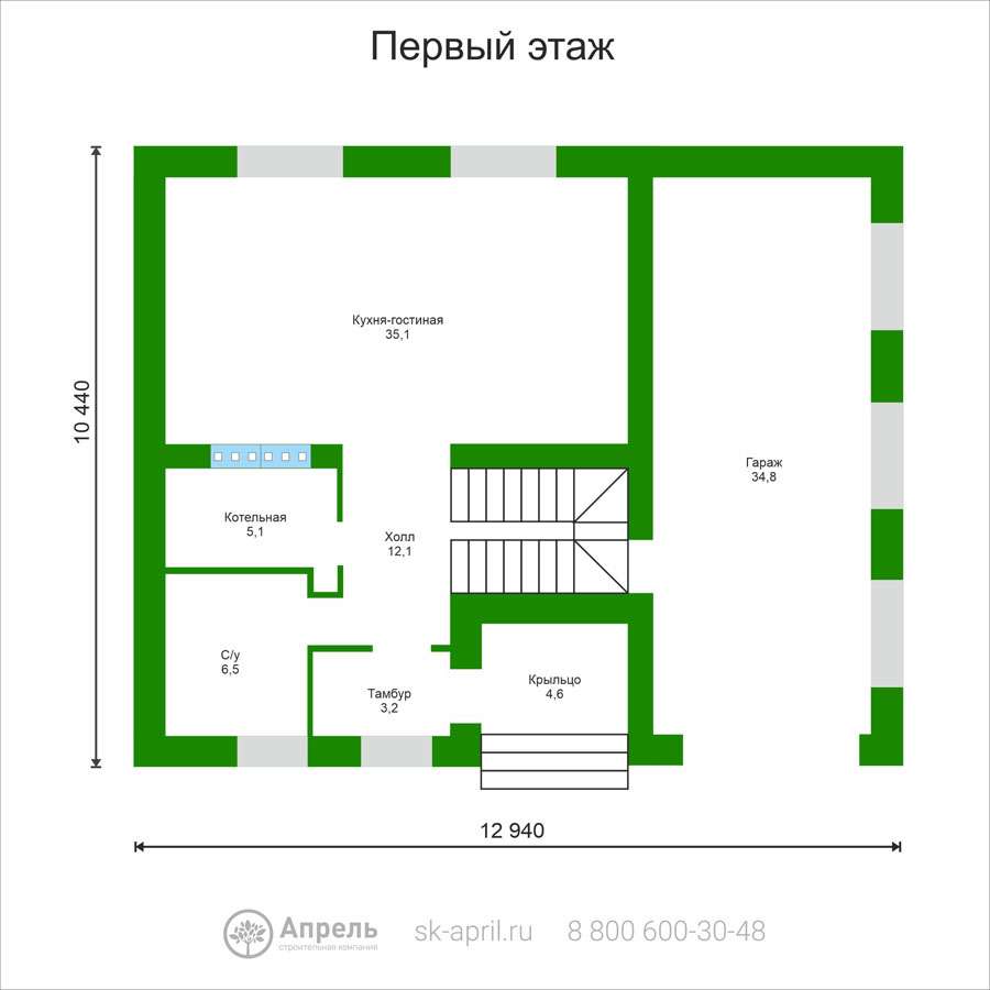 Стеновой блок Teplit D 500 (600x400x250), армирование стен (первый и каждый третий ряд + подоконные и дверные проемы). Армирующий железобетонный пояс (сечением 350х150 мм с утеплением по внешнему периметру). Оконные и дверные перемычки (стальной уголок равнополочный)