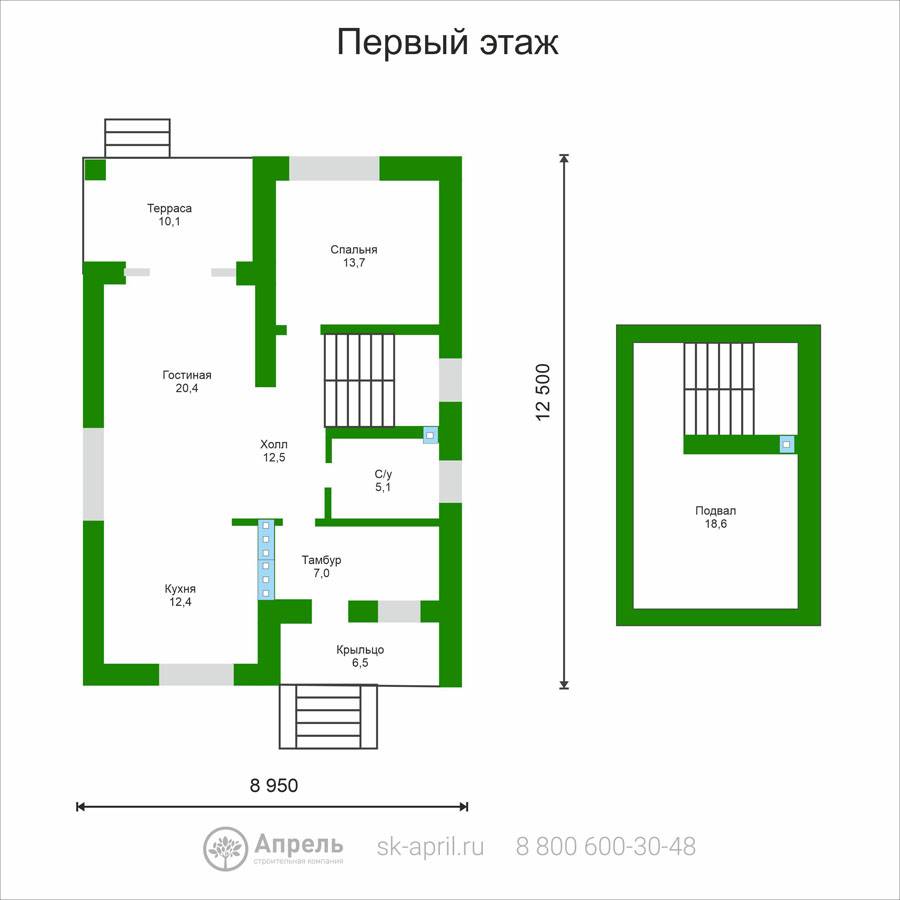 Стеновой блок Teplit D 500 (600x400x250), армирование стен (первый и каждый третий ряд + подоконные и дверные проемы). Армирующий железобетонный пояс (сечением 350х150 мм с утеплением по внешнему периметру). Оконные и дверные перемычки (стальной уголок равнополочный)