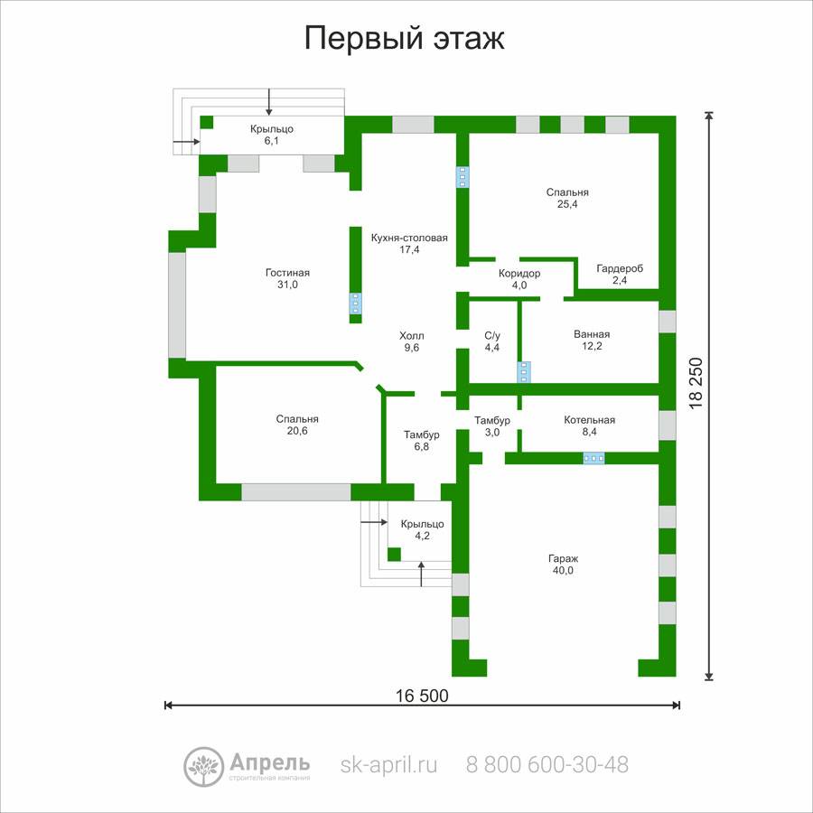 Стеновой блок Teplit D 500 (600x400x250), армирование стен (первый и каждый третий ряд + подоконные и дверные проемы). Армирующий железобетонный пояс (сечением 350х150 мм с утеплением по внешнему периметру). Оконные и дверные перемычки (стальной уголок равнополочный)