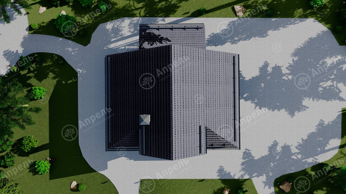 Стропильный каркас (доска сечением 200х50 мм), обрешетка (доска сечением 150х25 мм). Контробрешетка из бруска (50х50 мм). Пропитка пиломатериала огнебиозащитой. Ветро-влагозащитная мембрана Изоспан. Кровля — металлочерепица Grand Line (толщина 0,5 мм). Обшивка свесов кровли виниловыми софитами, монтаж ветровой планки.