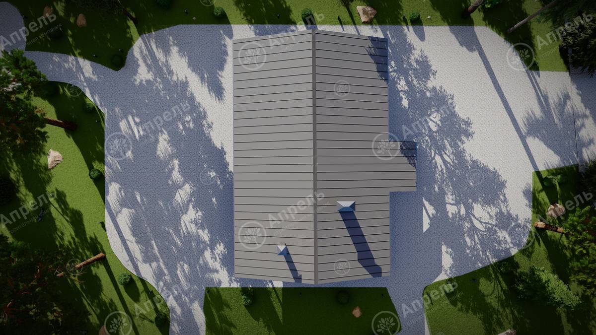 Стропильный каркас (доска сечением 200х50 мм), обрешетка (доска сечением 150х25 мм). Контробрешетка из бруска (50х50 мм). Пропитка пиломатериала огнебиозащитой. Ветро-влагозащитная мембрана Изоспан. Кровля — металлочерепица Grand Line (толщина 0,5 мм). Обшивка свесов кровли виниловыми софитами, монтаж ветровой планки.
