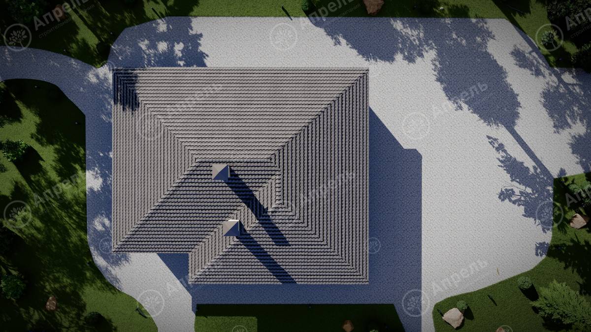 Стропильный каркас (доска сечением 200х50 мм), обрешетка (доска сечением 150х25 мм). Контробрешетка из бруска (50х50 мм). Пропитка пиломатериала огнебиозащитой. Ветро-влагозащитная мембрана Изоспан. Кровля — металлочерепица Grand Line (толщина 0,5 мм). Обшивка свесов кровли виниловыми софитами, монтаж ветровой планки.