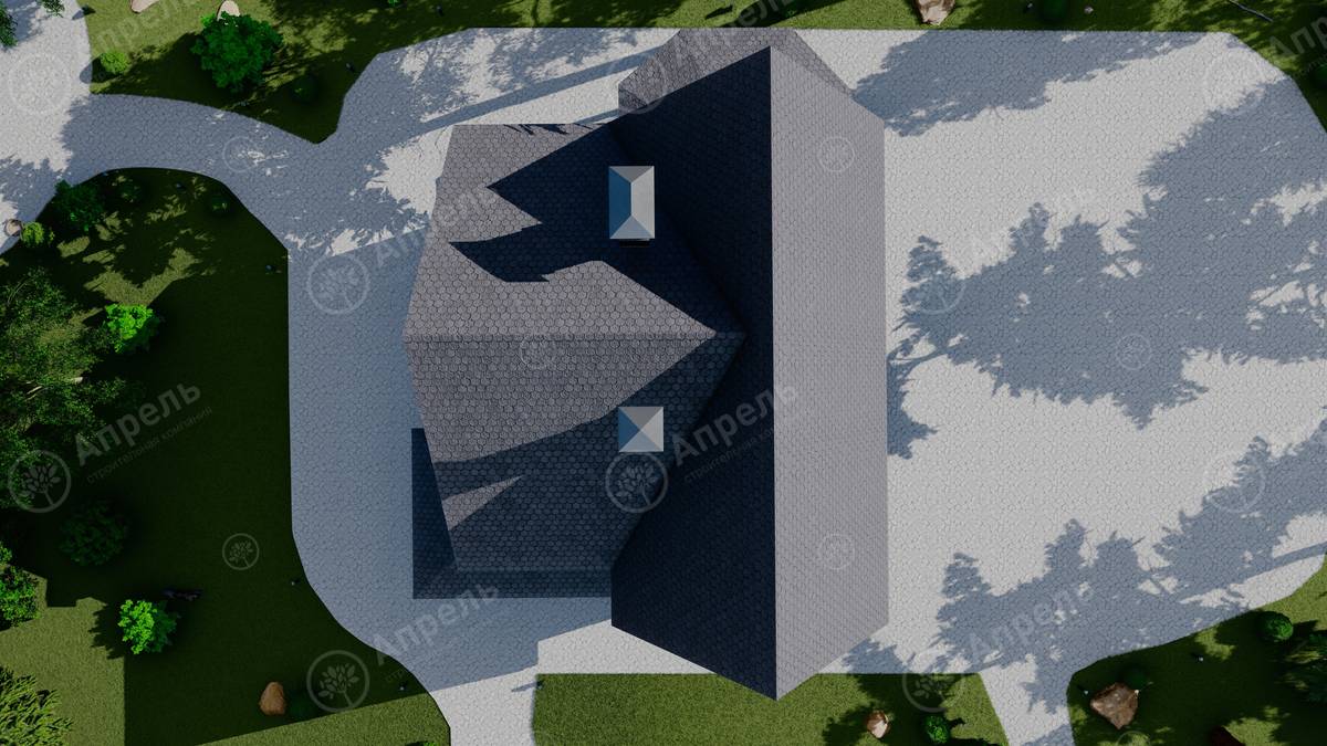 Стропильный каркас (доска сечением 200х50 мм), обрешетка (доска сечением 150х25 мм). Контробрешетка из бруска (50х50 мм). Пропитка пиломатериала огнебиозащитой. Ветро-влагозащитная мембрана Изоспан. Кровля — металлочерепица Grand Line (толщина 0,5 мм). Обшивка свесов кровли виниловыми софитами, монтаж ветровой планки.