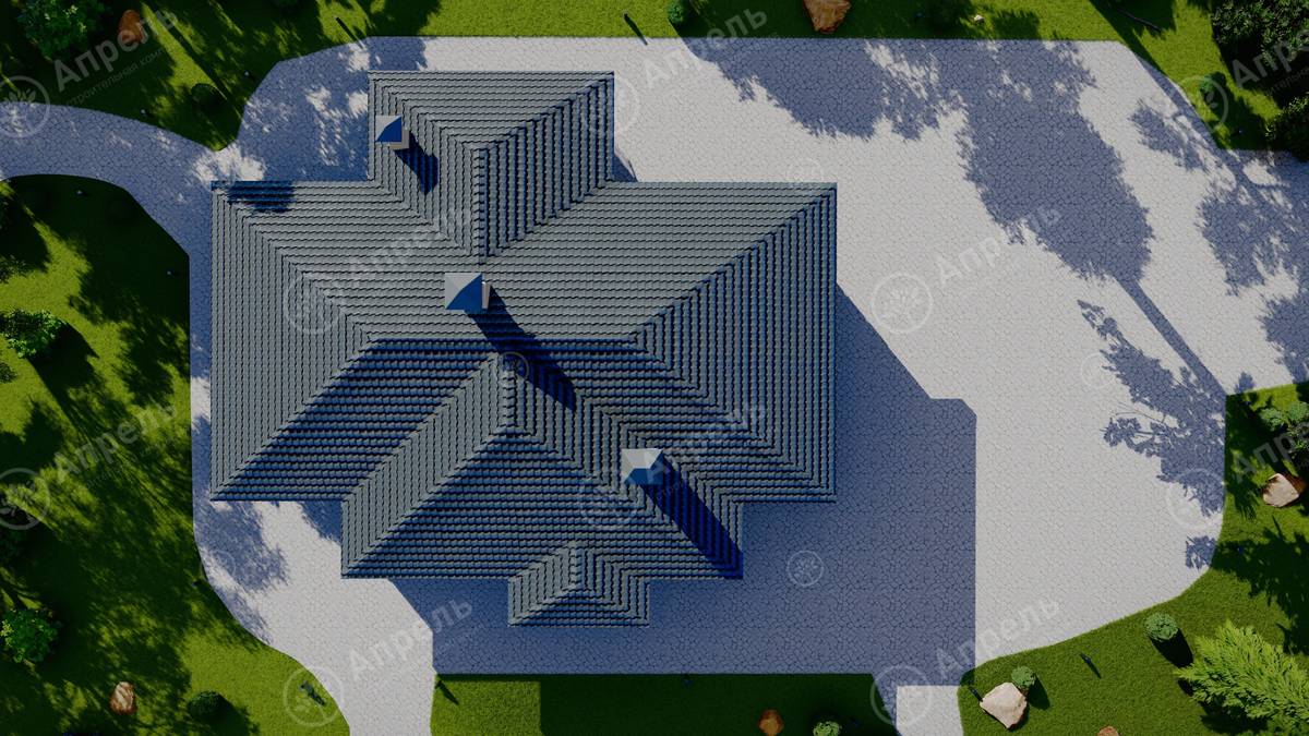 Стропильный каркас (доска сечением 200х50 мм), обрешетка (доска сечением 150х25 мм). Контробрешетка из бруска (50х50 мм). Пропитка пиломатериала огнебиозащитой. Ветро-влагозащитная мембрана Изоспан. Кровля — металлочерепица Grand Line (толщина 0,5 мм). Обшивка свесов кровли виниловыми софитами, монтаж ветровой планки.