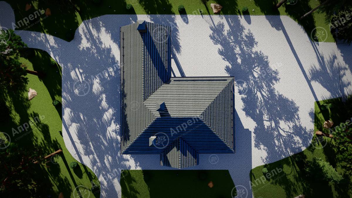 Стропильный каркас (доска сечением 200х50 мм), обрешетка (доска сечением 150х25 мм). Контробрешетка из бруска (50х50 мм). Пропитка пиломатериала огнебиозащитой. Ветро-влагозащитная мембрана Изоспан. Кровля — металлочерепица Grand Line (толщина 0,5 мм). Обшивка свесов кровли виниловыми софитами, монтаж ветровой планки.