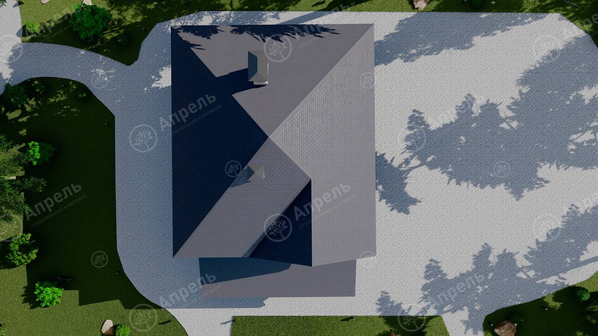 Стропильный каркас (доска сечением 200х50 мм), обрешетка (доска сечением 150х25 мм). Контробрешетка из бруска (50х50 мм). Пропитка пиломатериала огнебиозащитой. Ветро-влагозащитная мембрана Изоспан. Кровля — металлочерепица Grand Line (толщина 0,5 мм). Обшивка свесов кровли виниловыми софитами, монтаж ветровой планки.