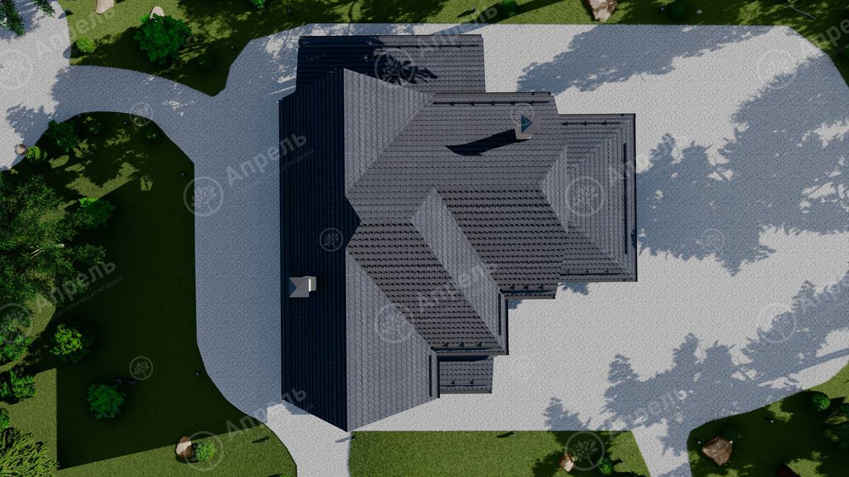 Стропильный каркас (доска сечением 200х50 мм), обрешетка (доска сечением 150х25 мм). Контробрешетка из бруска (50х50 мм). Пропитка пиломатериала огнебиозащитой. Ветро-влагозащитная мембрана Изоспан. Кровля — металлочерепица Grand Line (толщина 0,5 мм). Обшивка свесов кровли виниловыми софитами, монтаж ветровой планки.