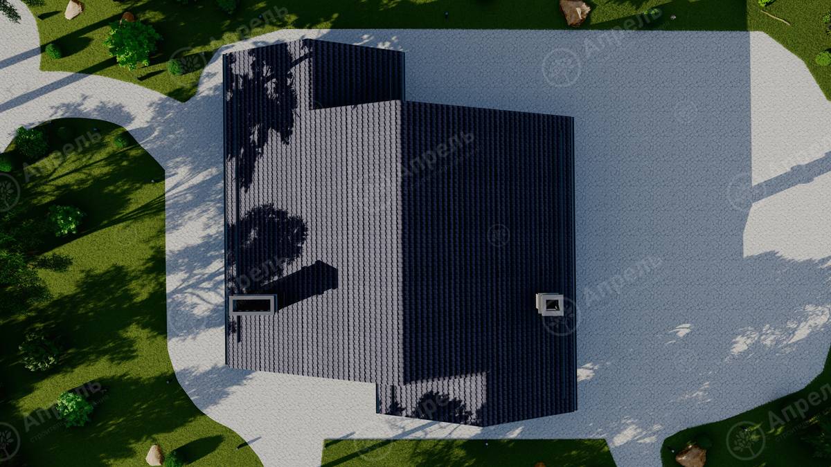 Стропильный каркас (доска сечением 200х50 мм), обрешетка (доска сечением 150х25 мм). Контробрешетка из бруска (50х50 мм). Пропитка пиломатериала огнебиозащитой. Ветро-влагозащитная мембрана Изоспан. Кровля — металлочерепица Grand Line (толщина 0,5 мм). Обшивка свесов кровли виниловыми софитами, монтаж ветровой планки.