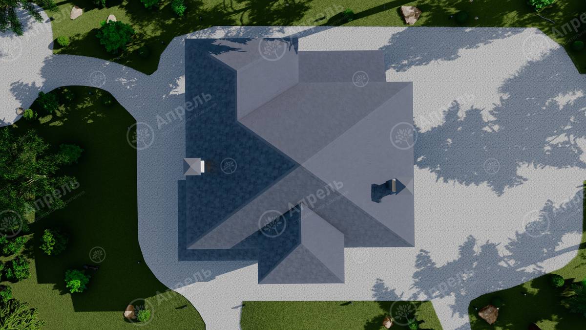 Стропильный каркас (доска сечением 200х50 мм), обрешетка (доска сечением 150х25 мм). Контробрешетка из бруска (50х50 мм). Пропитка пиломатериала огнебиозащитой. Ветро-влагозащитная мембрана Изоспан. Кровля — металлочерепица Grand Line (толщина 0,5 мм). Обшивка свесов кровли виниловыми софитами, монтаж ветровой планки.