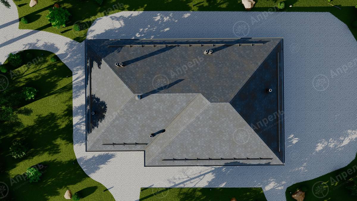 Стропильный каркас (доска сечением 200х50 мм), обрешетка (доска сечением 150х25 мм). Контробрешетка из бруска (50х50 мм). Пропитка пиломатериала огнебиозащитой. Ветро-влагозащитная мембрана Изоспан. Кровля — металлочерепица Grand Line (толщина 0,5 мм). Обшивка свесов кровли виниловыми софитами, монтаж ветровой планки.