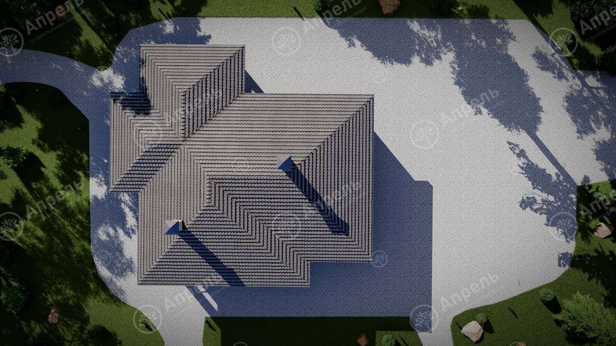 Стропильный каркас (доска сечением 200х50 мм), обрешетка (доска сечением 150х25 мм). Контробрешетка из бруска (50х50 мм). Пропитка пиломатериала огнебиозащитой. Ветро-влагозащитная мембрана Изоспан. Кровля — металлочерепица Grand Line (толщина 0,5 мм). Обшивка свесов кровли виниловыми софитами, монтаж ветровой планки.