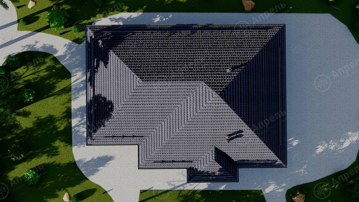 Стропильный каркас (доска сечением 200х50 мм), обрешетка (доска сечением 150х25 мм). Контробрешетка из бруска (50х50 мм). Пропитка пиломатериала огнебиозащитой. Ветро-влагозащитная мембрана Изоспан. Кровля — металлочерепица Grand Line (толщина 0,5 мм). Обшивка свесов кровли виниловыми софитами, монтаж ветровой планки.