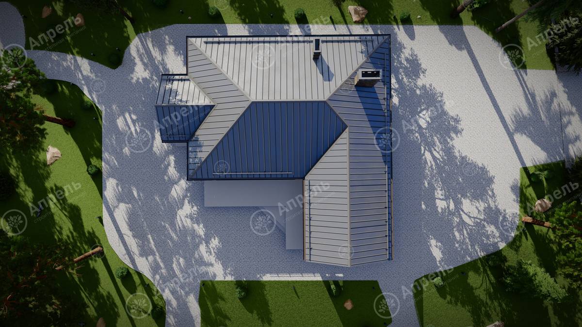 Стропильный каркас (доска сечением 200х50 мм), обрешетка (доска сечением 150х25 мм). Контробрешетка из бруска (50х50 мм). Пропитка пиломатериала огнебиозащитой. Ветро-влагозащитная мембрана Изоспан. Кровля — металлочерепица Grand Line (толщина 0,5 мм). Обшивка свесов кровли виниловыми софитами, монтаж ветровой планки.