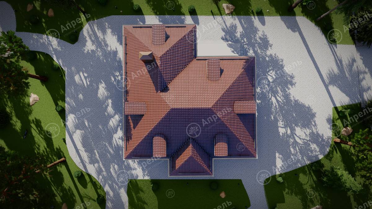 Стропильный каркас (доска сечением 200х50 мм), обрешетка (доска сечением 150х25 мм). Контробрешетка из бруска (50х50 мм). Пропитка пиломатериала огнебиозащитой. Ветро-влагозащитная мембрана Изоспан. Кровля — металлочерепица Grand Line (толщина 0,5 мм). Обшивка свесов кровли виниловыми софитами, монтаж ветровой планки.