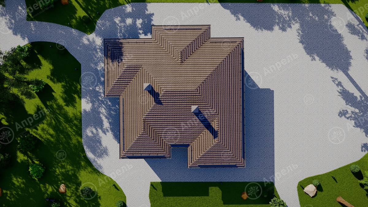 Стропильный каркас (доска сечением 200х50 мм), обрешетка (доска сечением 150х25 мм). Контробрешетка из бруска (50х50 мм). Пропитка пиломатериала огнебиозащитой. Ветро-влагозащитная мембрана Изоспан. Кровля — металлочерепица Grand Line (толщина 0,5 мм). Обшивка свесов кровли виниловыми софитами, монтаж ветровой планки.