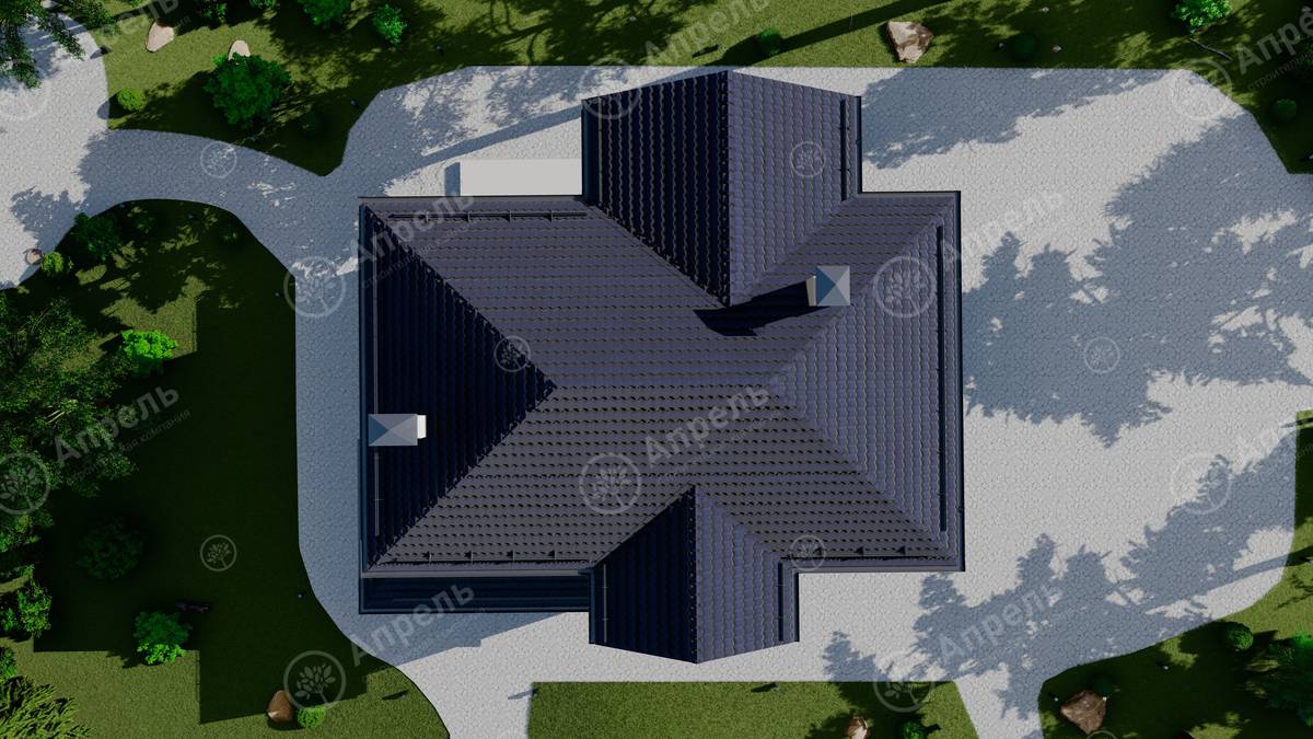 Стропильный каркас (доска сечением 200х50 мм), обрешетка (доска сечением 150х25 мм). Контробрешетка из бруска (50х50 мм). Пропитка пиломатериала огнебиозащитой. Ветро-влагозащитная мембрана Изоспан. Кровля — металлочерепица Grand Line (толщина 0,5 мм). Обшивка свесов кровли виниловыми софитами, монтаж ветровой планки.
