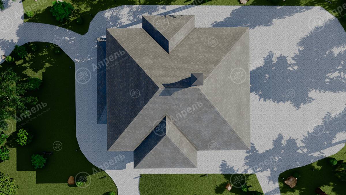 Стропильный каркас (доска сечением 200х50 мм), обрешетка (доска сечением 150х25 мм). Контробрешетка из бруска (50х50 мм). Пропитка пиломатериала огнебиозащитой. Ветро-влагозащитная мембрана Изоспан. Кровля — металлочерепица Grand Line (толщина 0,5 мм). Обшивка свесов кровли виниловыми софитами, монтаж ветровой планки.