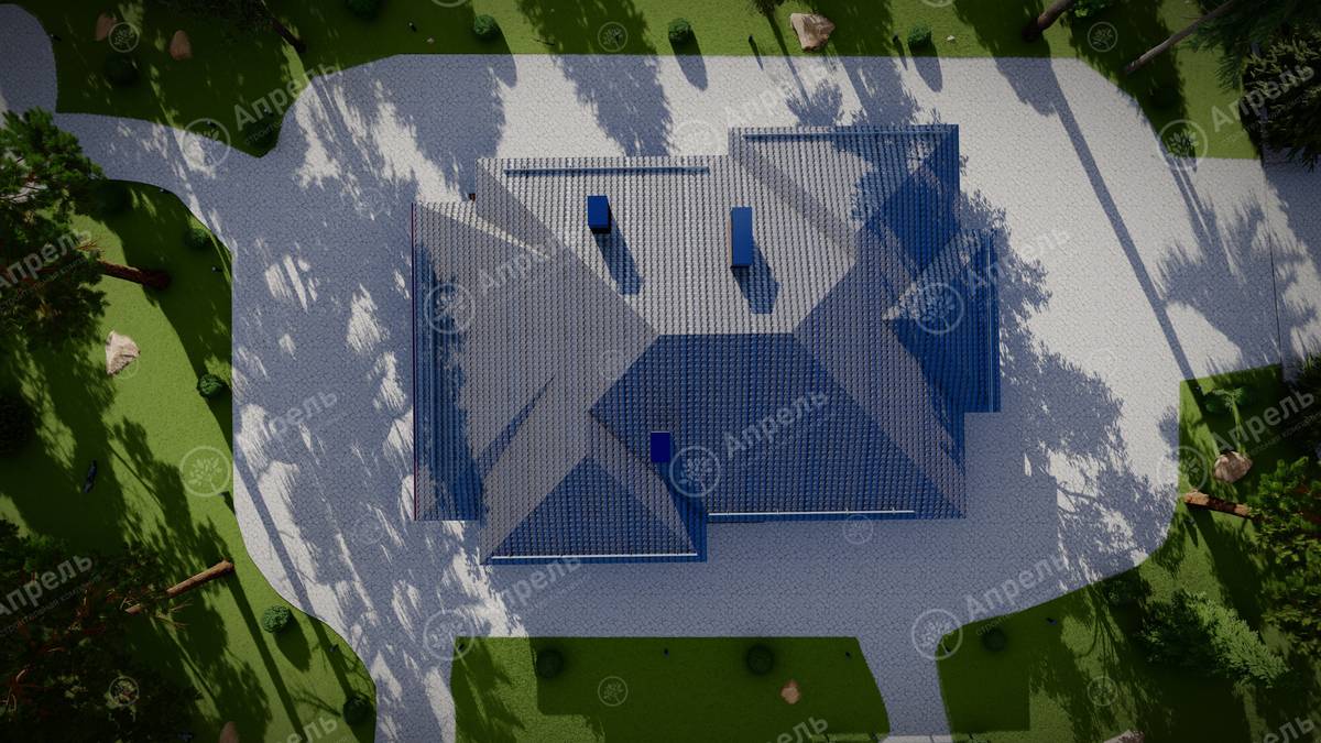 Стропильный каркас (доска сечением 200х50 мм), обрешетка (доска сечением 150х25 мм). Контробрешетка из бруска (50х50 мм). Пропитка пиломатериала огнебиозащитой. Ветро-влагозащитная мембрана Изоспан. Кровля — металлочерепица Grand Line (толщина 0,5 мм). Обшивка свесов кровли виниловыми софитами, монтаж ветровой планки.