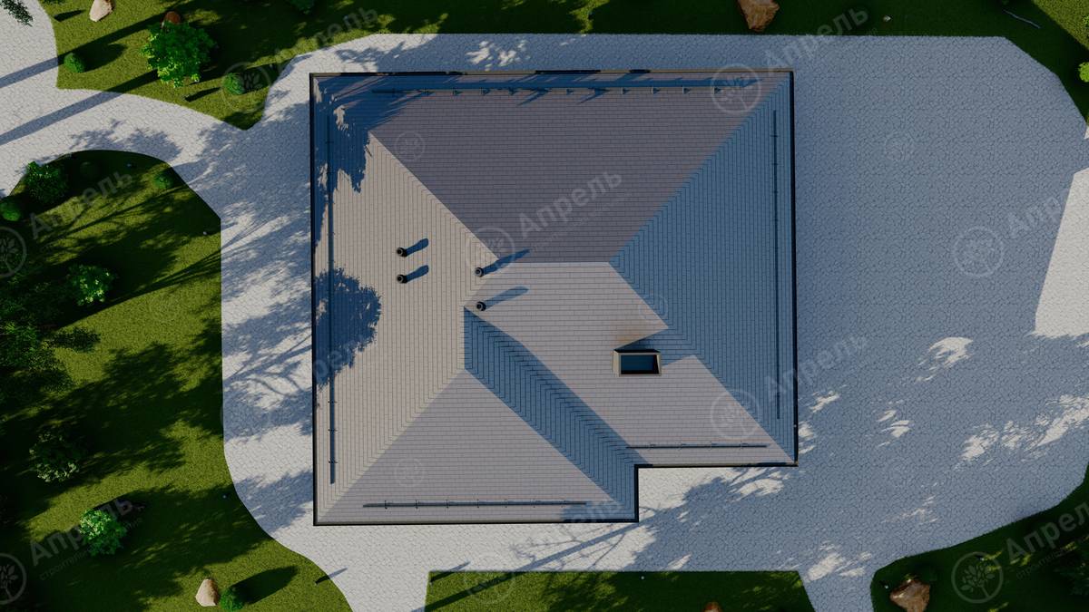 Стропильный каркас (доска сечением 200х50 мм), обрешетка (доска сечением 150х25 мм). Контробрешетка из бруска (50х50 мм). Пропитка пиломатериала огнебиозащитой. Ветро-влагозащитная мембрана Изоспан. Кровля — металлочерепица Grand Line (толщина 0,5 мм). Обшивка свесов кровли виниловыми софитами, монтаж ветровой планки.