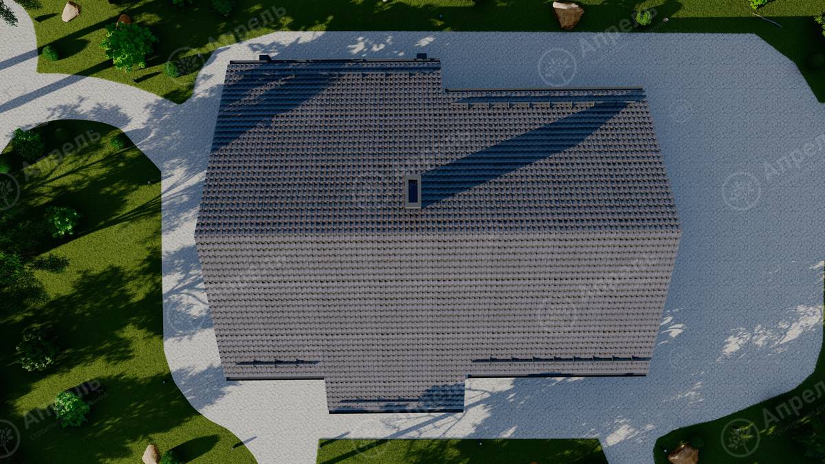 Стропильный каркас (доска сечением 200х50 мм), обрешетка (доска сечением 150х25 мм). Контробрешетка из бруска (50х50 мм). Пропитка пиломатериала огнебиозащитой. Ветро-влагозащитная мембрана Изоспан. Кровля — металлочерепица Grand Line (толщина 0,5 мм). Обшивка свесов кровли виниловыми софитами, монтаж ветровой планки.