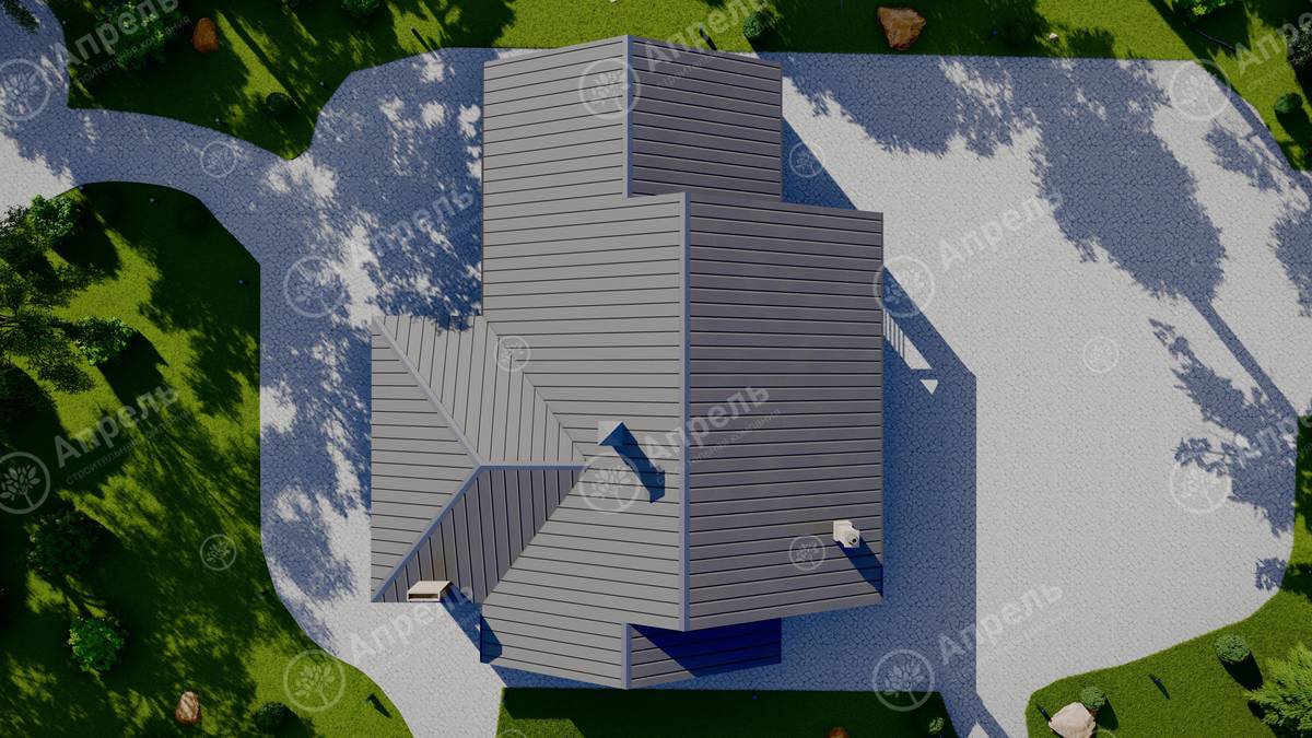 Стропильный каркас (доска сечением 200х50 мм), обрешетка (доска сечением 150х25 мм). Контробрешетка из бруска (50х50 мм). Пропитка пиломатериала огнебиозащитой. Ветро-влагозащитная мембрана Изоспан. Кровля — металлочерепица Grand Line (толщина 0,5 мм). Обшивка свесов кровли виниловыми софитами, монтаж ветровой планки.