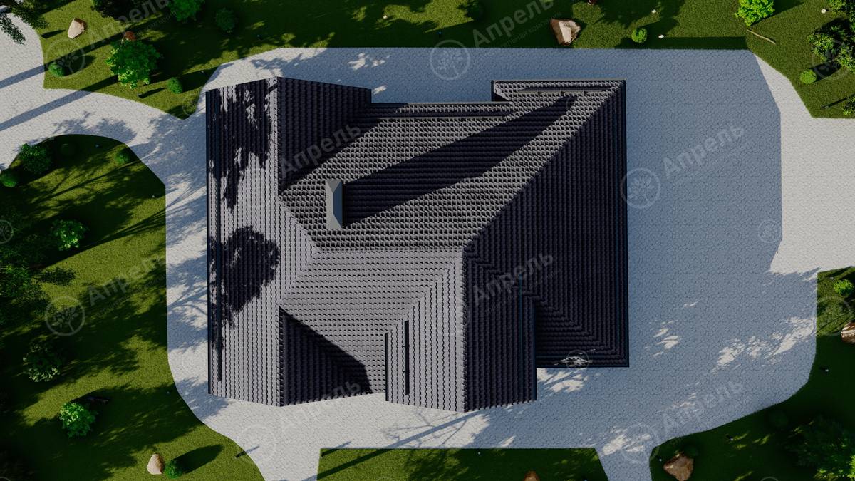 Стропильный каркас (доска сечением 200х50 мм), обрешетка (доска сечением 150х25 мм). Контробрешетка из бруска (50х50 мм). Пропитка пиломатериала огнебиозащитой. Ветро-влагозащитная мембрана Изоспан. Кровля — металлочерепица Grand Line (толщина 0,5 мм). Обшивка свесов кровли виниловыми софитами, монтаж ветровой планки.