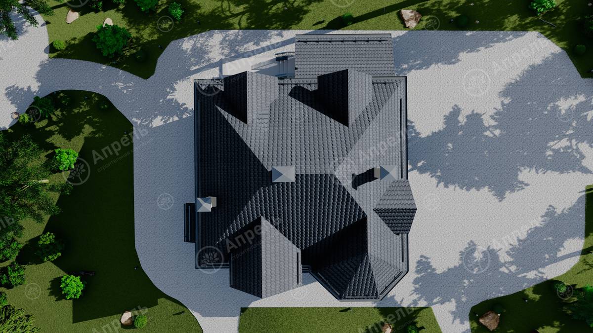 Стропильный каркас (доска сечением 200х50 мм), обрешетка (доска сечением 150х25 мм). Контробрешетка из бруска (50х50 мм). Пропитка пиломатериала огнебиозащитой. Ветро-влагозащитная мембрана Изоспан. Кровля — металлочерепица Grand Line (толщина 0,5 мм). Обшивка свесов кровли виниловыми софитами, монтаж ветровой планки.