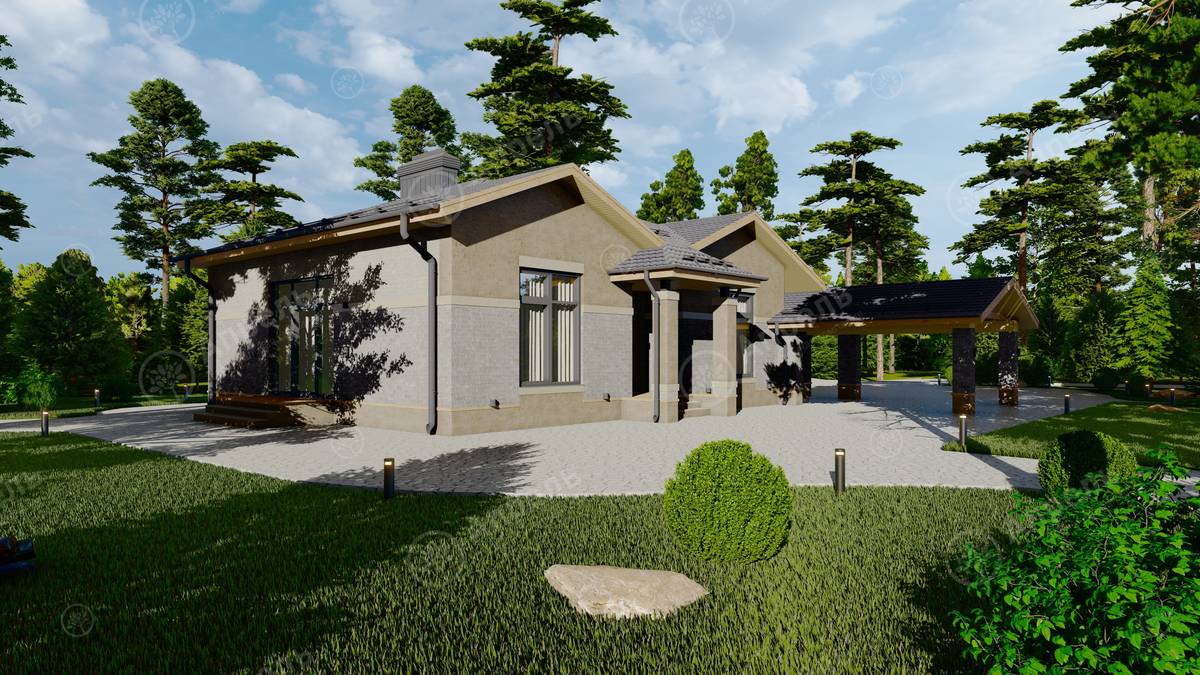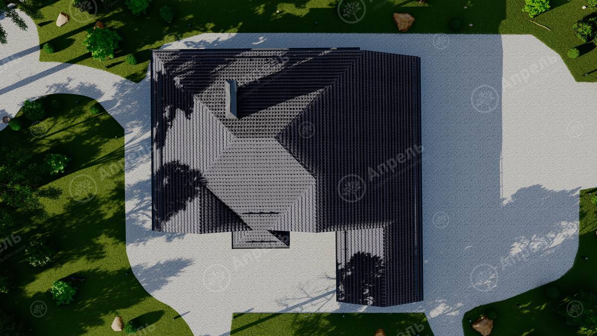 Стропильный каркас (доска сечением 200х50 мм), обрешетка (доска сечением 150х25 мм). Контробрешетка из бруска (50х50 мм). Пропитка пиломатериала огнебиозащитой. Ветро-влагозащитная мембрана Изоспан. Кровля — металлочерепица Grand Line (толщина 0,5 мм). Обшивка свесов кровли виниловыми софитами, монтаж ветровой планки.