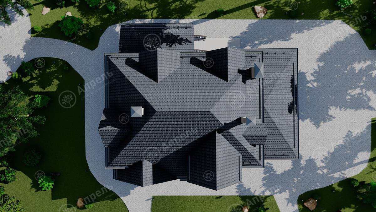 Стропильный каркас (доска сечением 200х50 мм), обрешетка (доска сечением 150х25 мм). Контробрешетка из бруска (50х50 мм). Пропитка пиломатериала огнебиозащитой. Ветро-влагозащитная мембрана Изоспан. Кровля — металлочерепица Grand Line (толщина 0,5 мм). Обшивка свесов кровли виниловыми софитами, монтаж ветровой планки.
