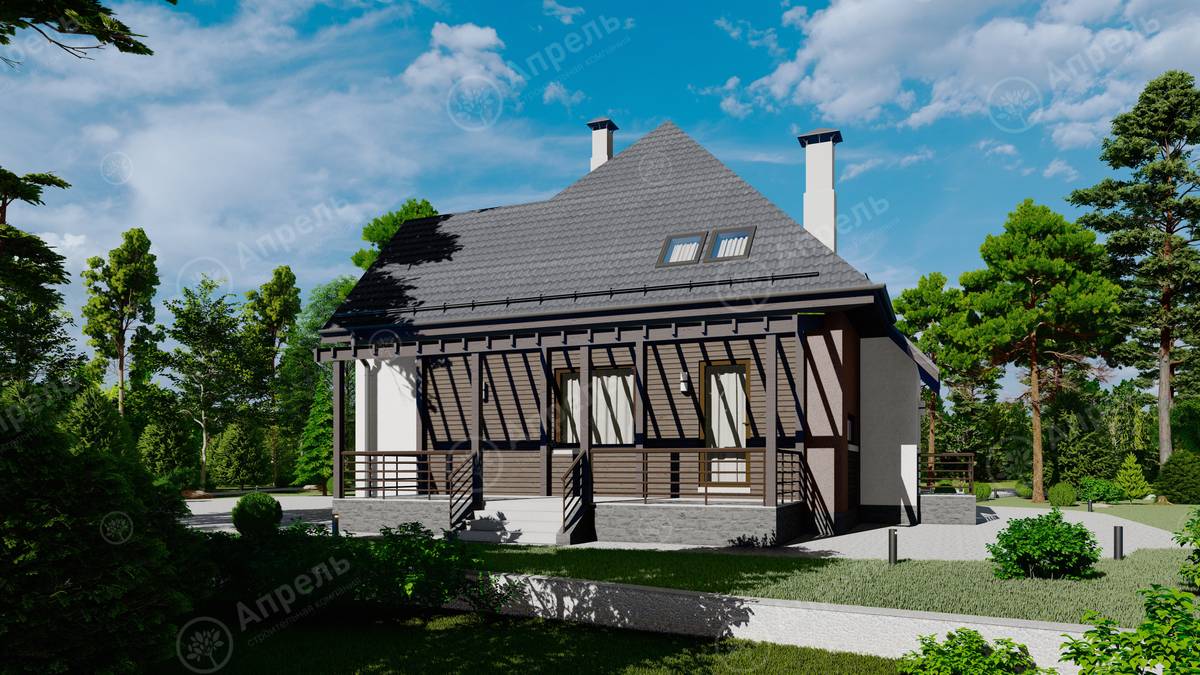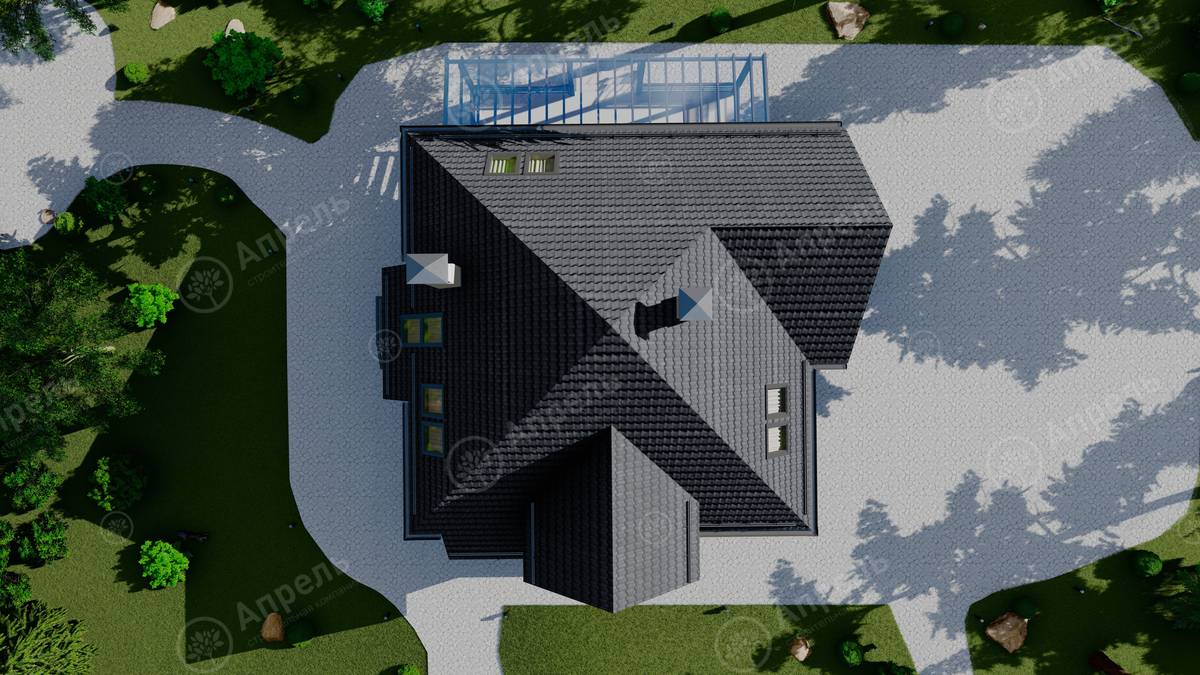 Стропильный каркас (доска сечением 200х50 мм), обрешетка (доска сечением 150х25 мм). Контробрешетка из бруска (50х50 мм). Пропитка пиломатериала огнебиозащитой. Ветро-влагозащитная мембрана Изоспан. Кровля — металлочерепица Grand Line (толщина 0,5 мм). Обшивка свесов кровли виниловыми софитами, монтаж ветровой планки.