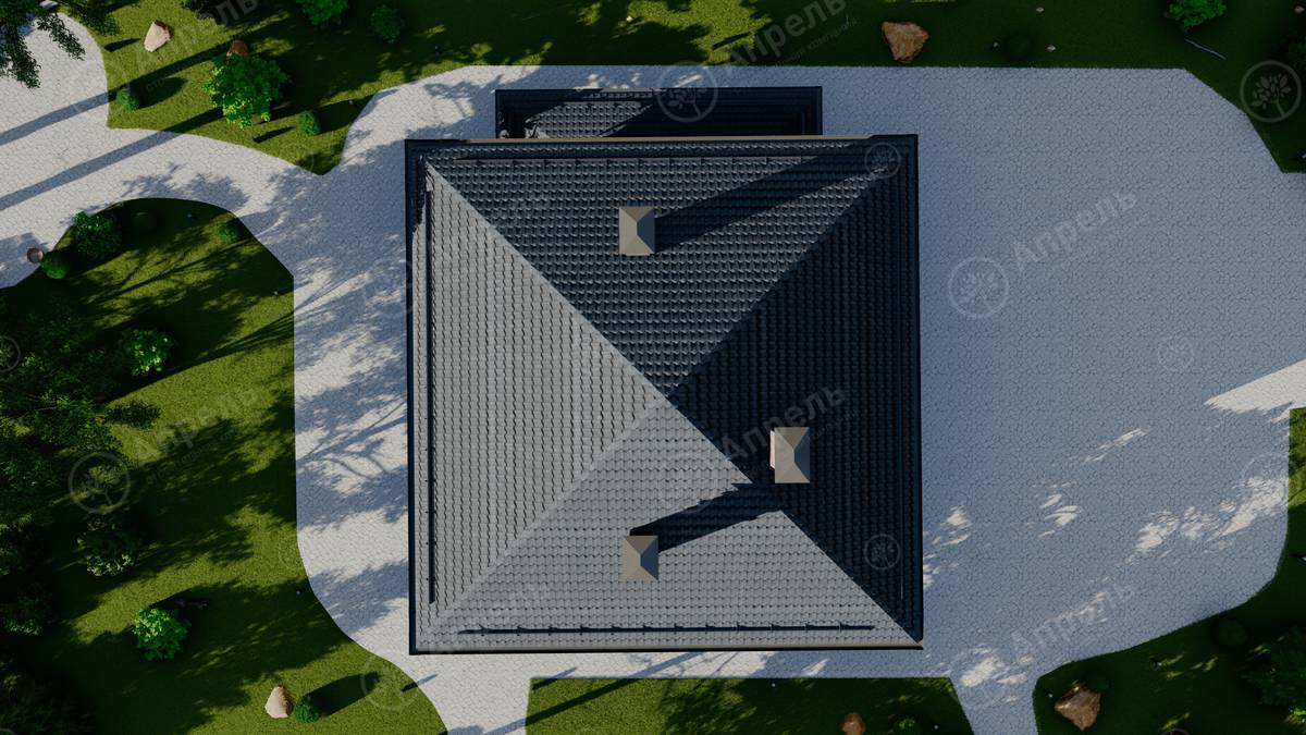 Стропильный каркас (доска сечением 200х50 мм), обрешетка (доска сечением 150х25 мм). Контробрешетка из бруска (50х50 мм). Пропитка пиломатериала огнебиозащитой. Ветро-влагозащитная мембрана Изоспан. Кровля — металлочерепица Grand Line (толщина 0,5 мм). Обшивка свесов кровли виниловыми софитами, монтаж ветровой планки.