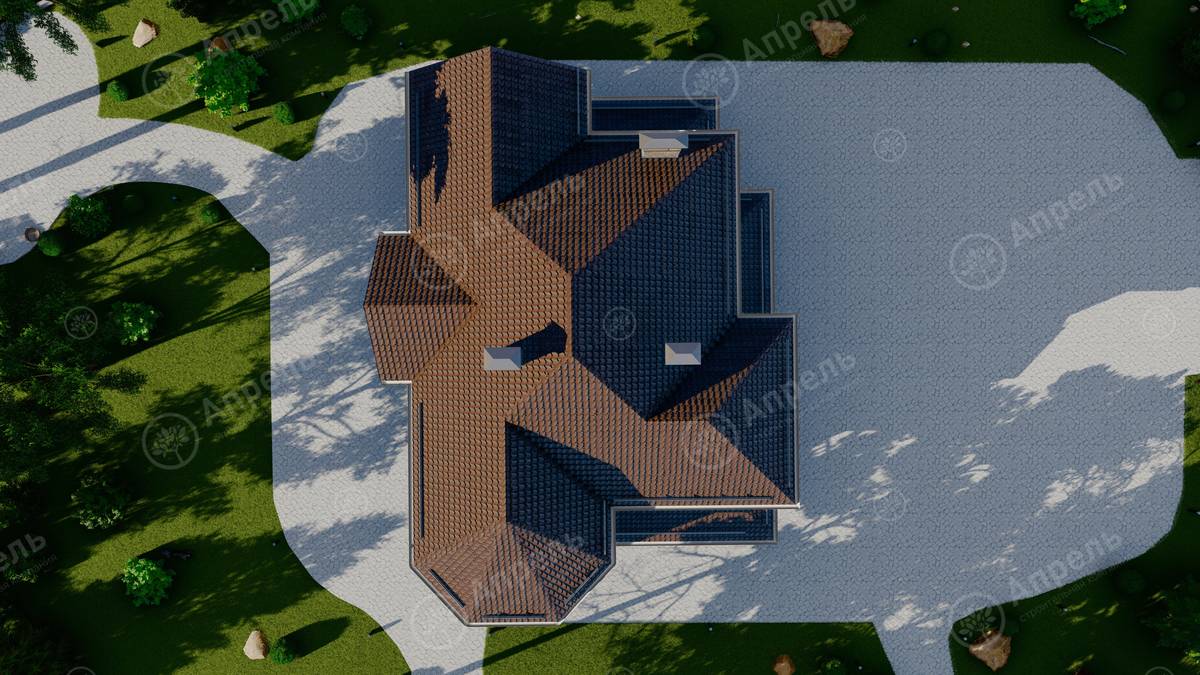 Стропильный каркас (доска сечением 200х50 мм), обрешетка (доска сечением 150х25 мм). Контробрешетка из бруска (50х50 мм). Пропитка пиломатериала огнебиозащитой. Ветро-влагозащитная мембрана Изоспан. Кровля — металлочерепица Grand Line (толщина 0,5 мм). Обшивка свесов кровли виниловыми софитами, монтаж ветровой планки.