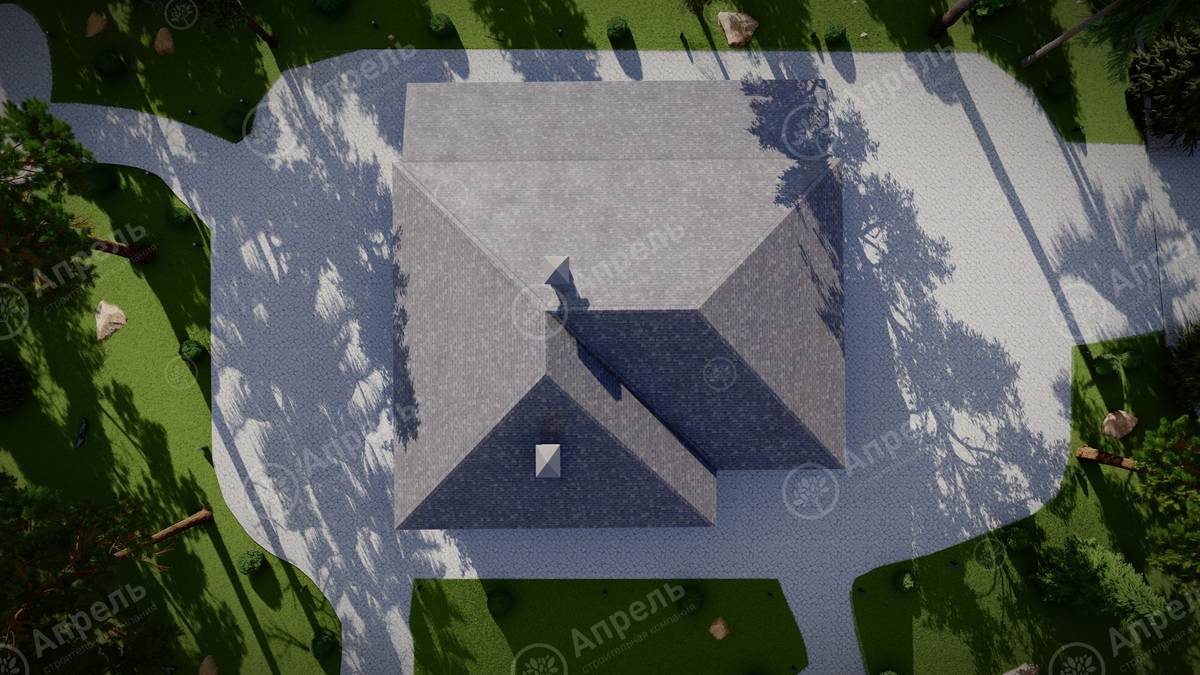 Стропильный каркас (доска сечением 200х50 мм), обрешетка (доска сечением 150х25 мм). Контробрешетка из бруска (50х50 мм). Пропитка пиломатериала огнебиозащитой. Ветро-влагозащитная мембрана Изоспан. Кровля — металлочерепица Grand Line (толщина 0,5 мм). Обшивка свесов кровли виниловыми софитами, монтаж ветровой планки.
